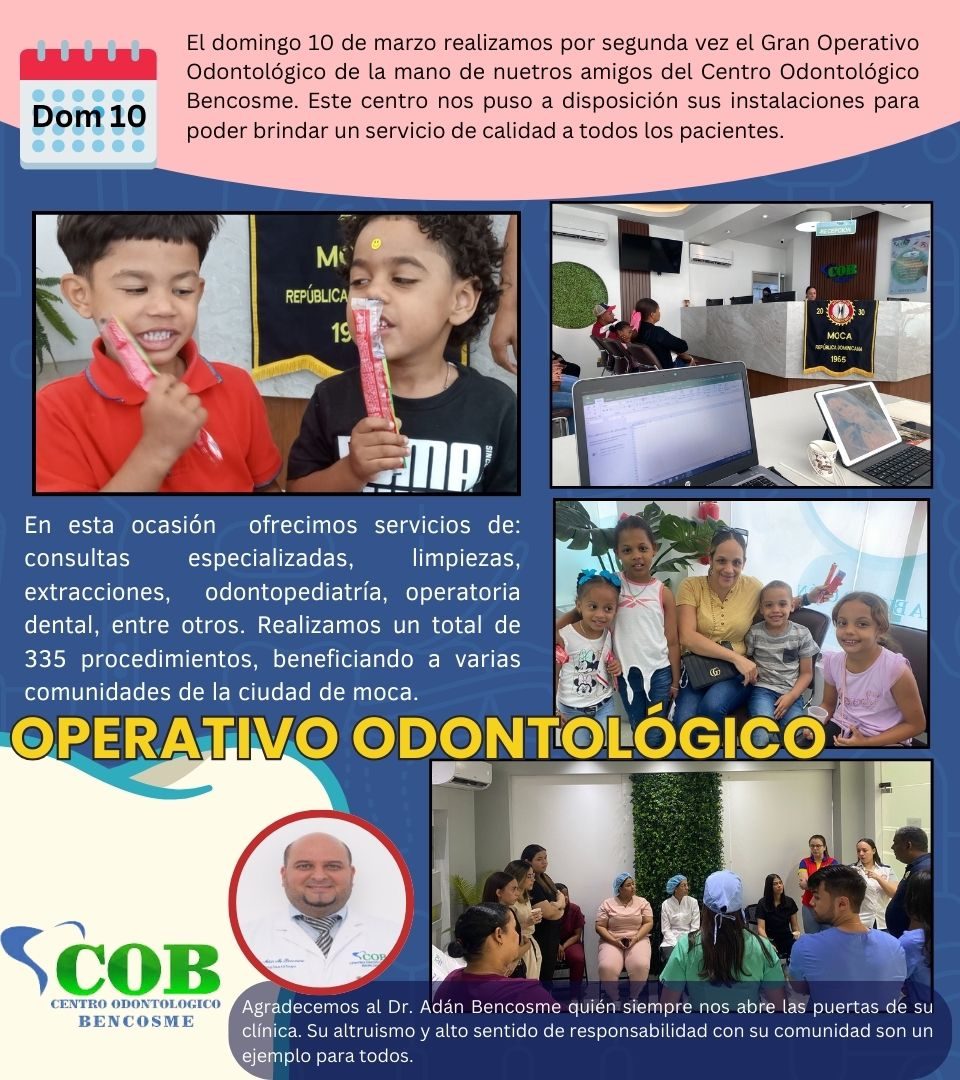 "Gracias al salvadoreño René Fernandez llega la organización al país, juramentando la primera directiva el 23 de agosto de 1962. Además, del Presidente Moisés Paiewonsky, firman la carta constitutiva, Radhamés Cantisano Arias, Miguel Ángel Delgado Batle, Leopoldo González Brache, Julio Heinsen, Francisco Izquierdo, Ramón Mirabal, Virgilio Ortiz Bosch, Jaime Roca Brache, Elías Rodríguez Brache, Ralph Schaimensky, Simón Váldez y Rafael César Vida. En la sesión inaugural fue juramentado Milcíades Pérez Polanco (autor del saludo a la bandera)."